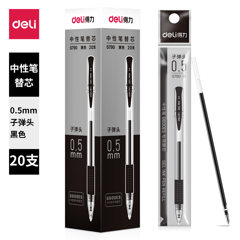 得力S790-0.5mm子弹头中性笔替芯(黑)(20支/盒)