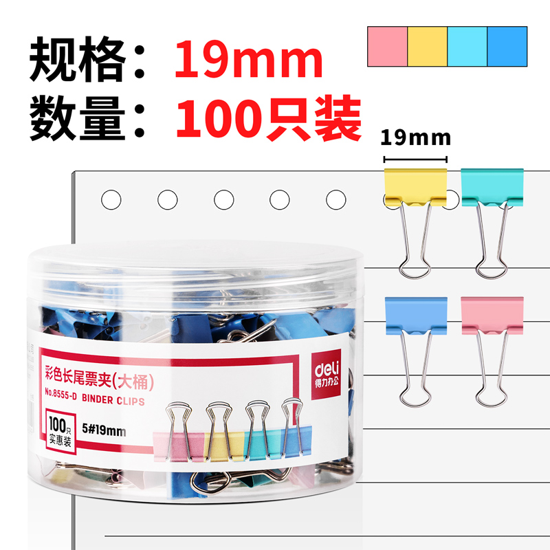 得力8555-D-19mm/100只大桶装长尾票夹