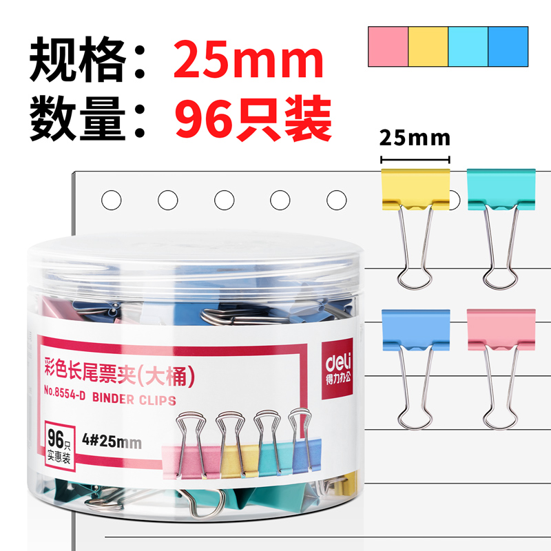 得力8554-48只桶装25mm精装彩色长尾票夹