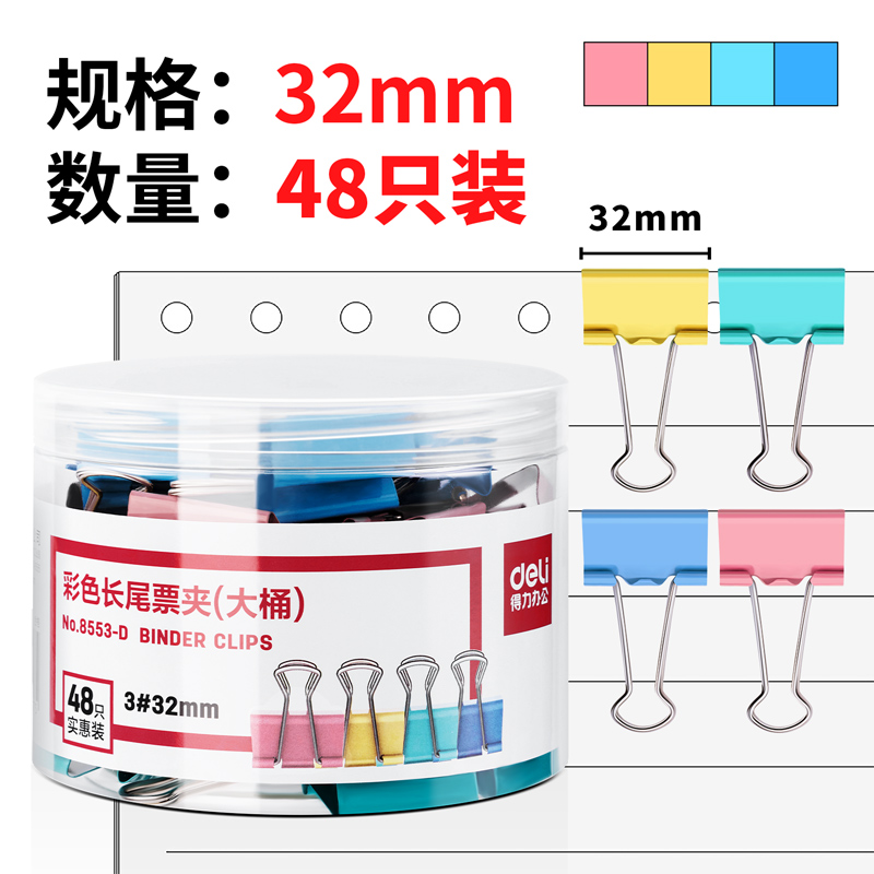 得力8553-24只桶装32mm精装彩色长尾票夹