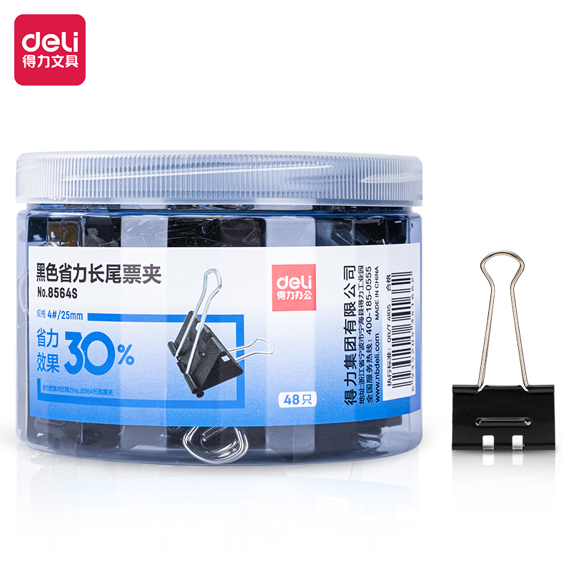 得力8564S-48只筒装25mm黑色省力长尾票夹