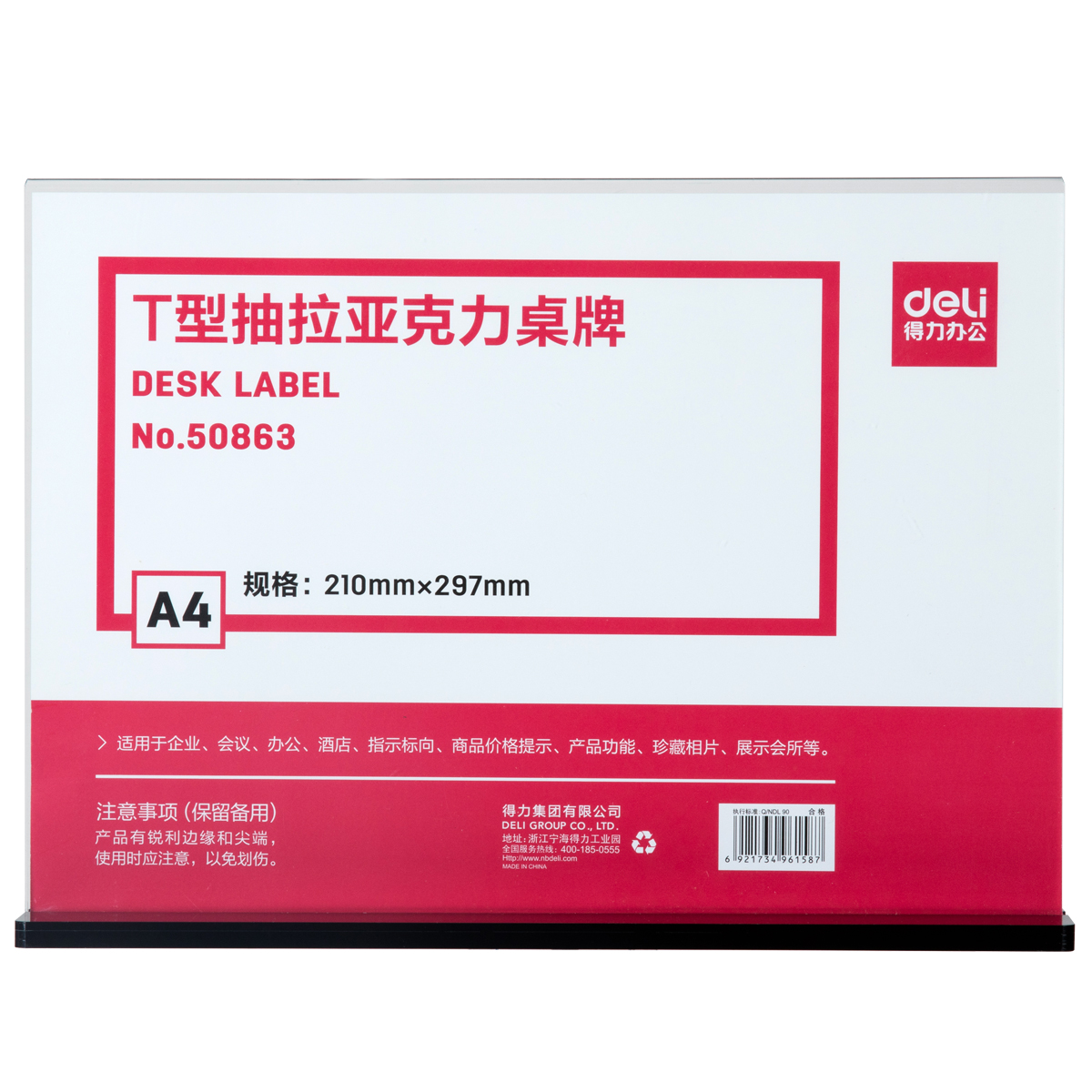 得力50863-T型抽拉亚克力桌牌210mm*297mm(12个/盒)