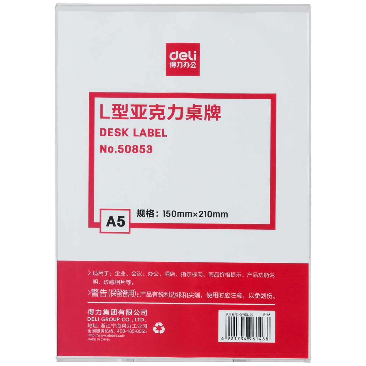 得力50853-L型亚克力桌牌150*210mm竖(48个/盒)