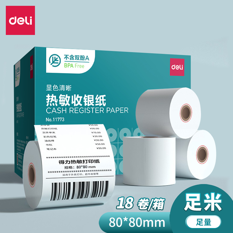 得力11773-80mm*80mm*60m不含双酚A热敏收银纸(白色)(18卷/箱)