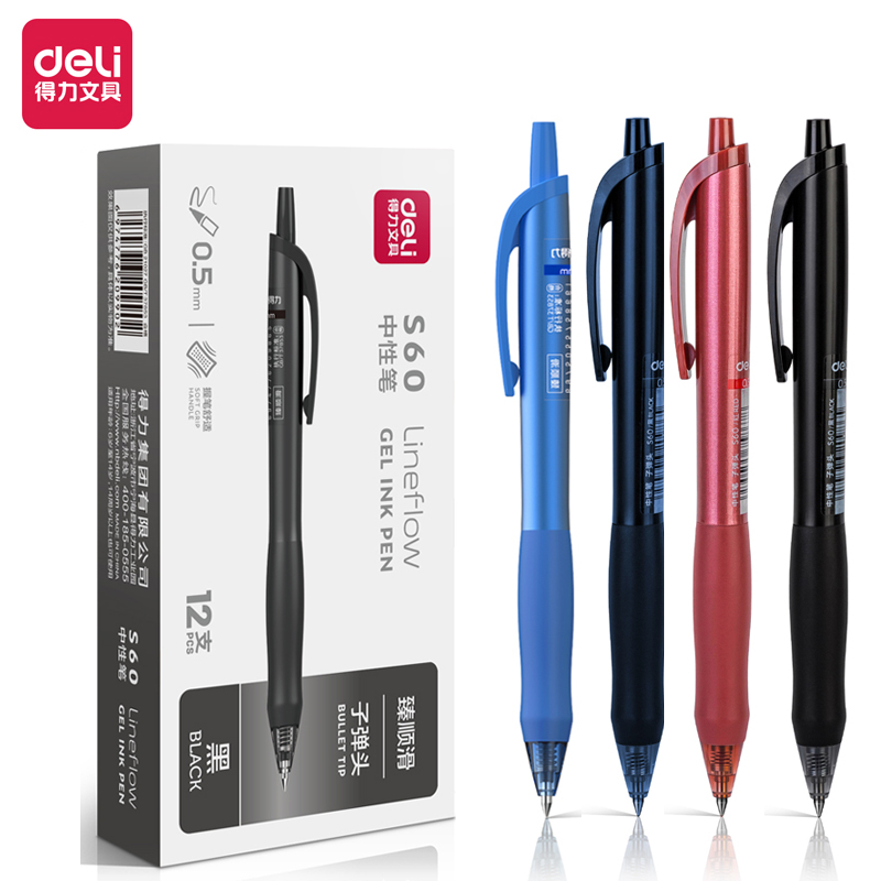得力S60-A-0.5mm子弹头臻顺滑弧度收口按动中性笔(12支/盒)